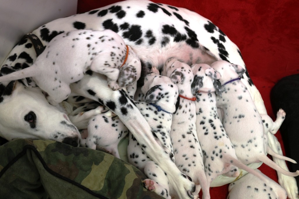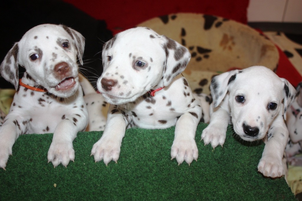 Die dritte Woche ist immer etwas anderes! Die Welpen sehen, hören und vor allen Dingen können sie laufen, spielen und schon Brei fressen. Auch die Punkte sind kräftiger geworden.
