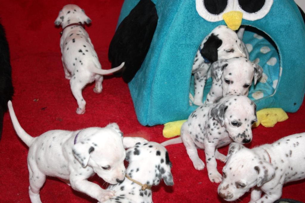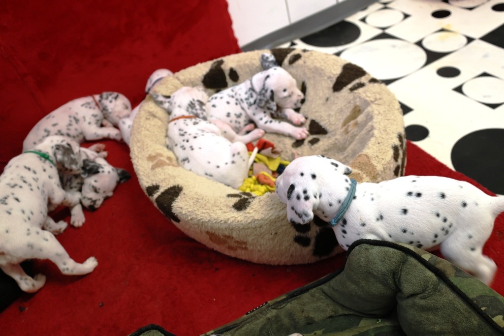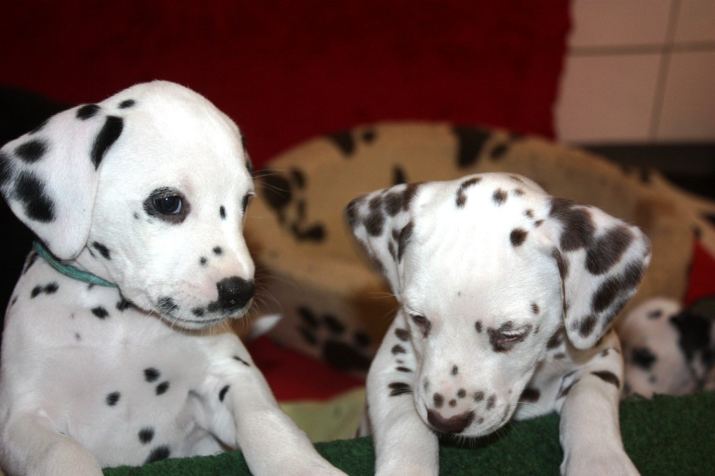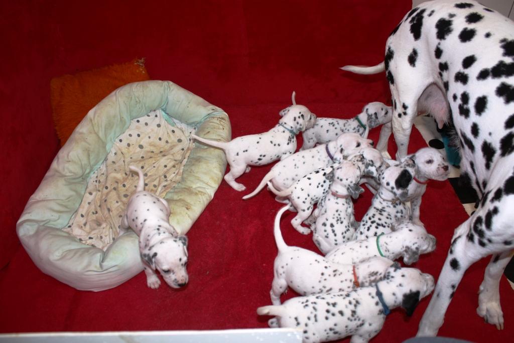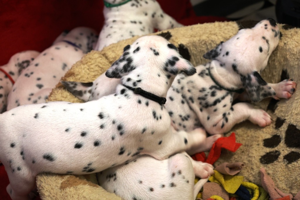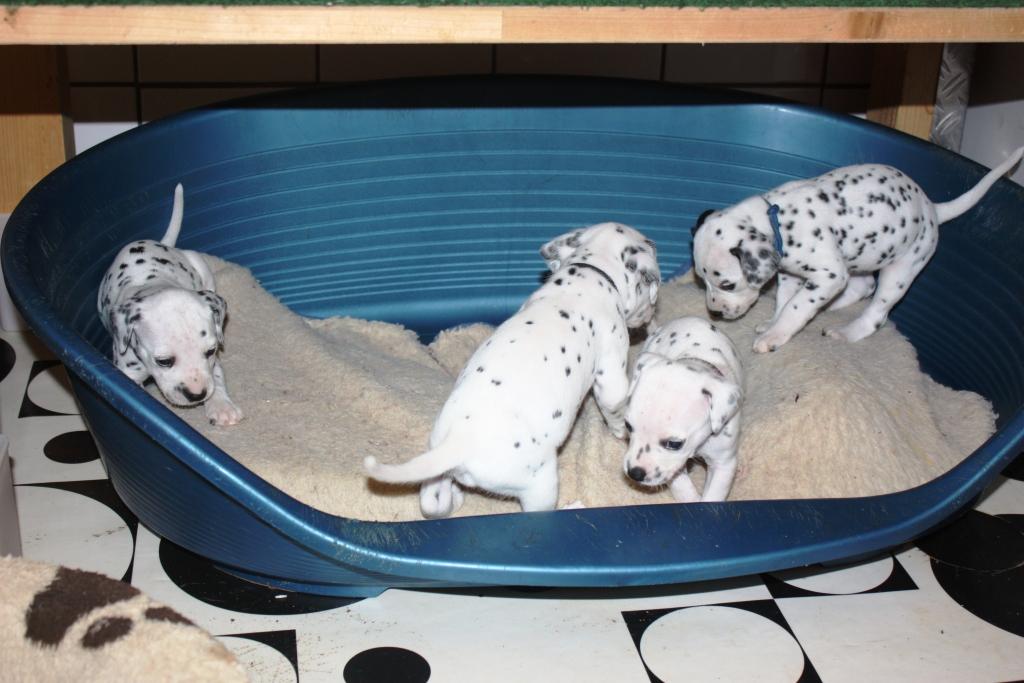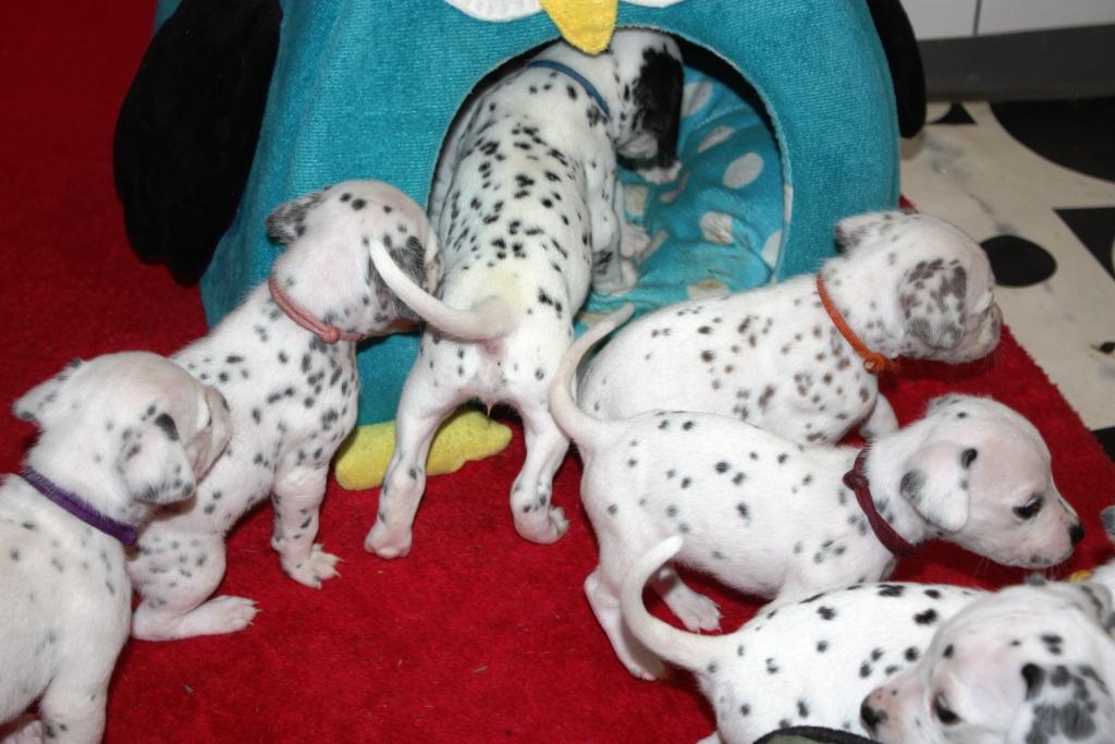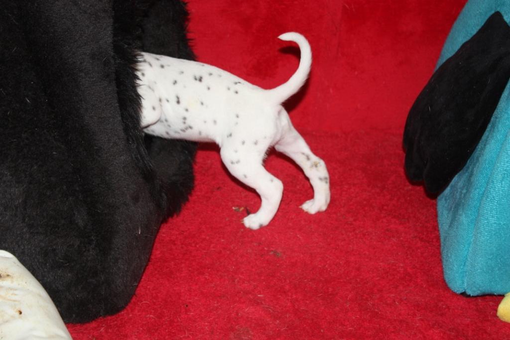 Die dritte Woche ist immer etwas anderes! Die Welpen sehen, hören und vor allen Dingen können sie laufen, spielen und schon Brei fressen. Auch die Punkte sind kräftiger geworden.