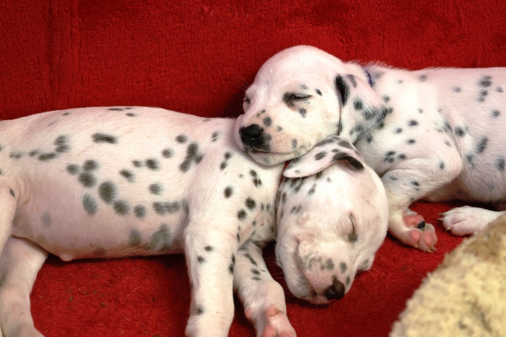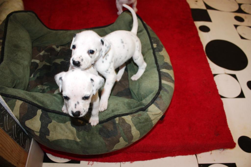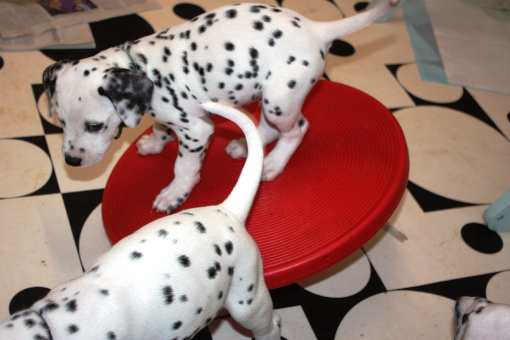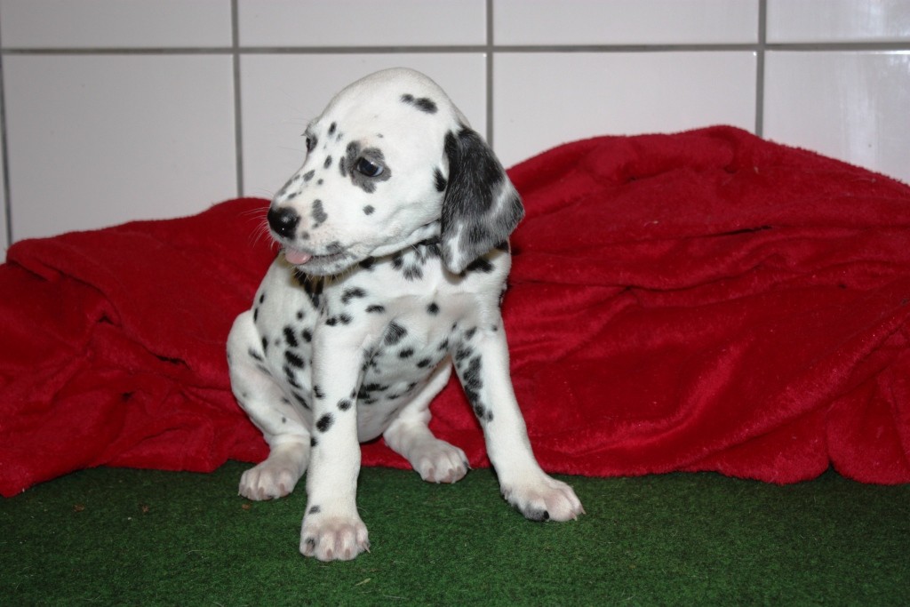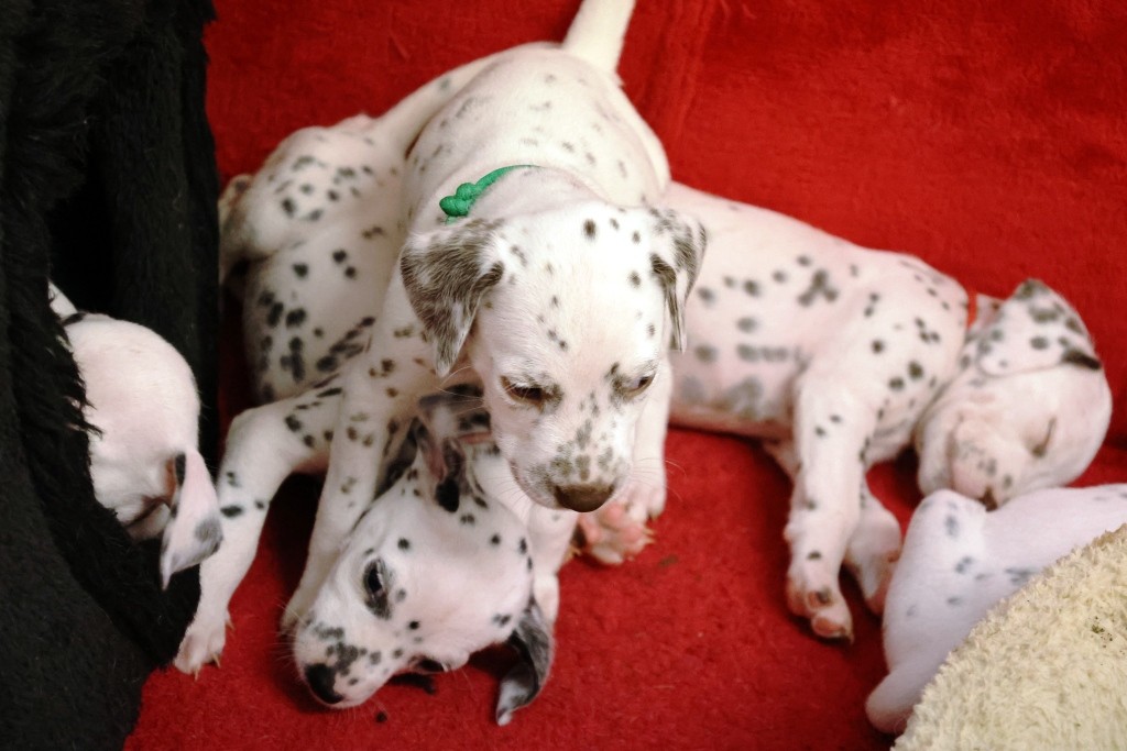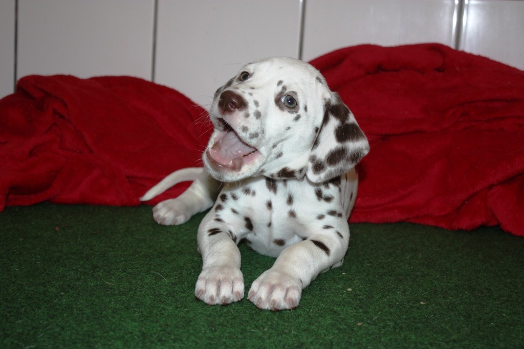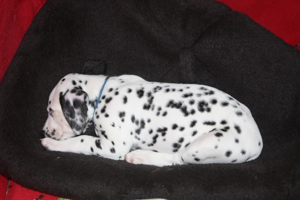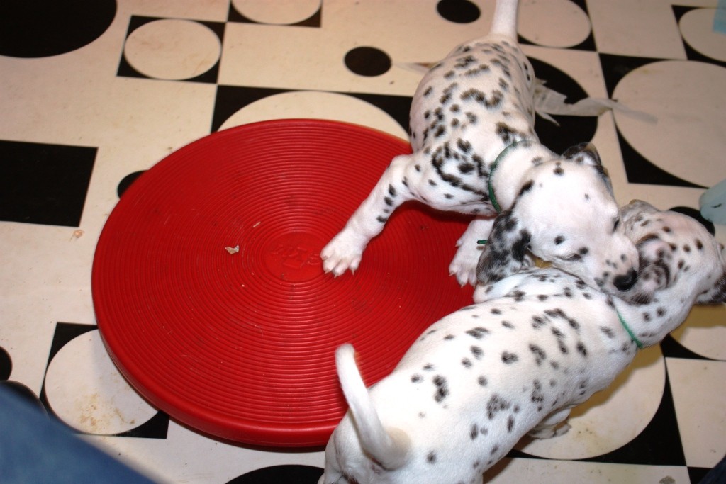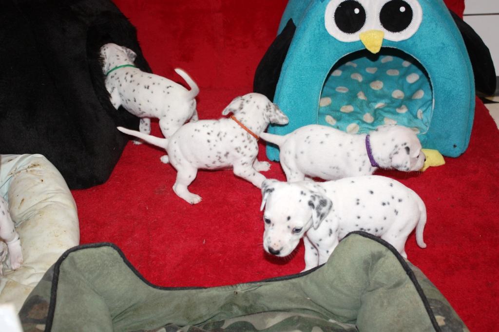 Die dritte Woche ist immer etwas anderes! Die Welpen sehen, hören und vor allen Dingen können sie laufen, spielen und schon Brei fressen. Auch die Punkte sind kräftiger geworden.
