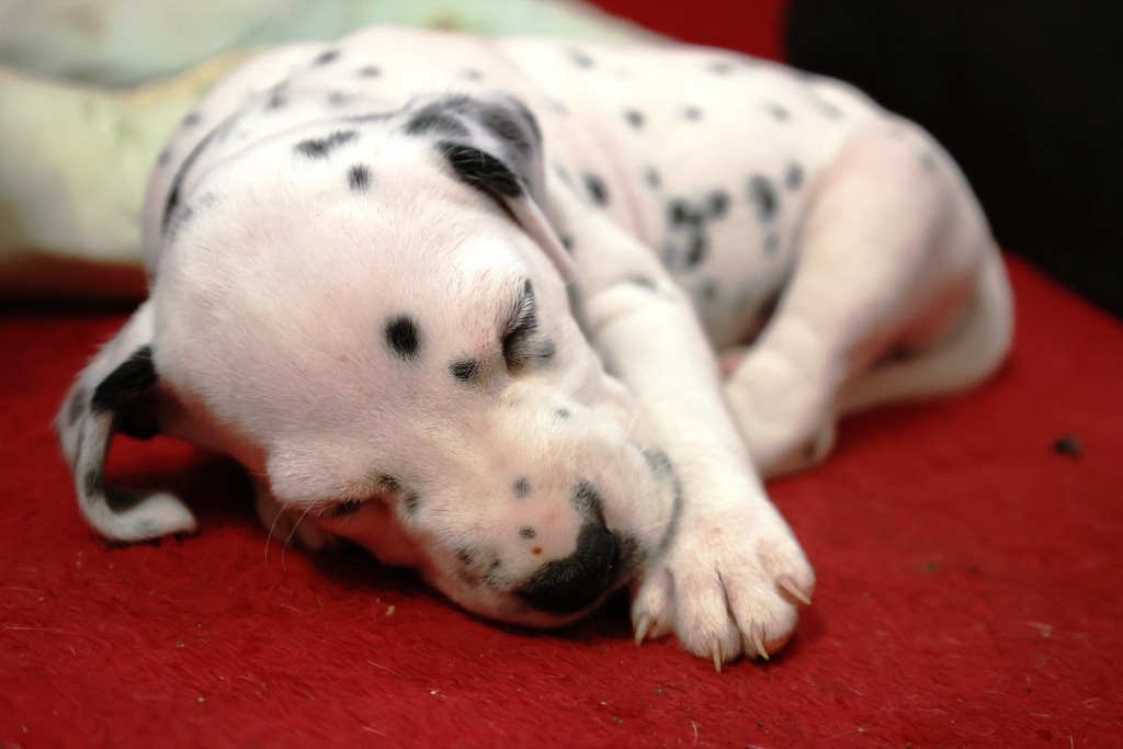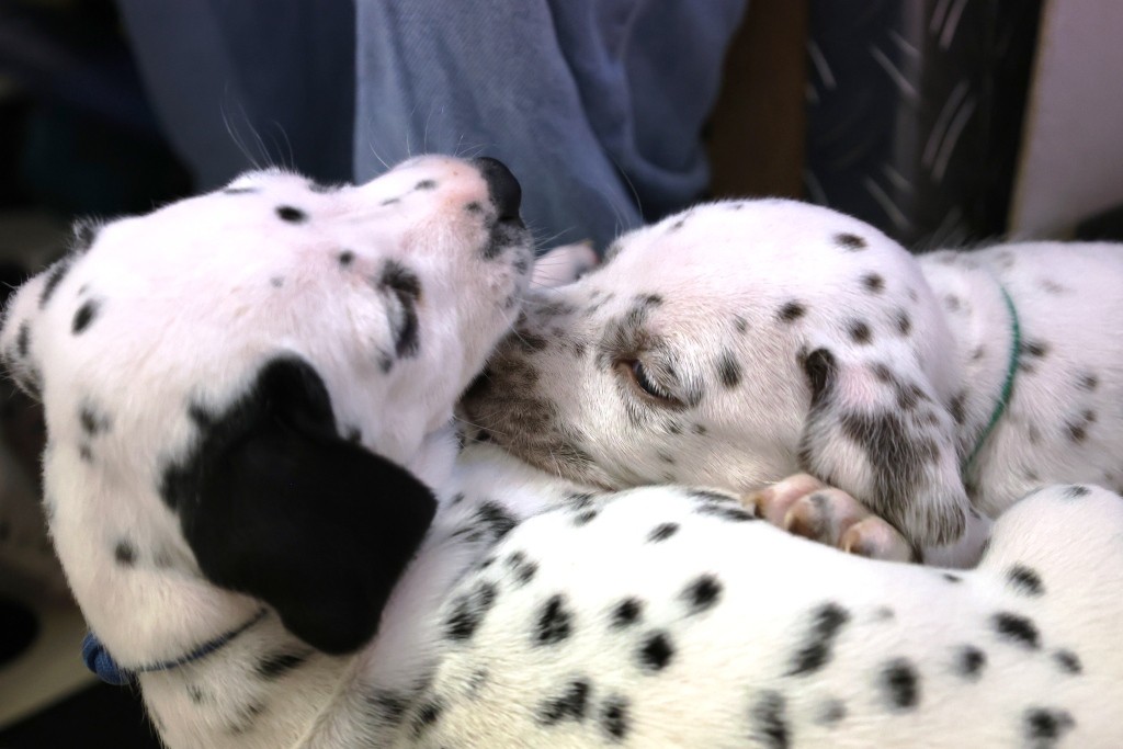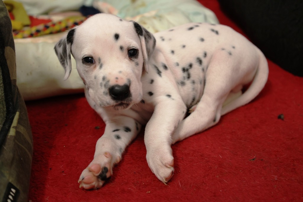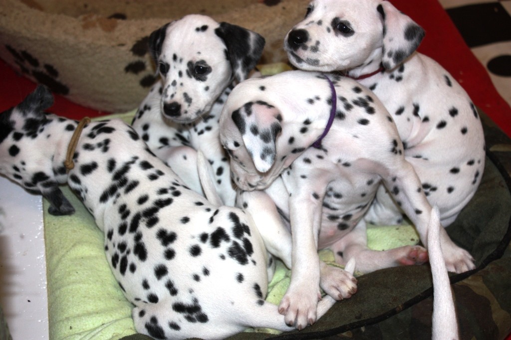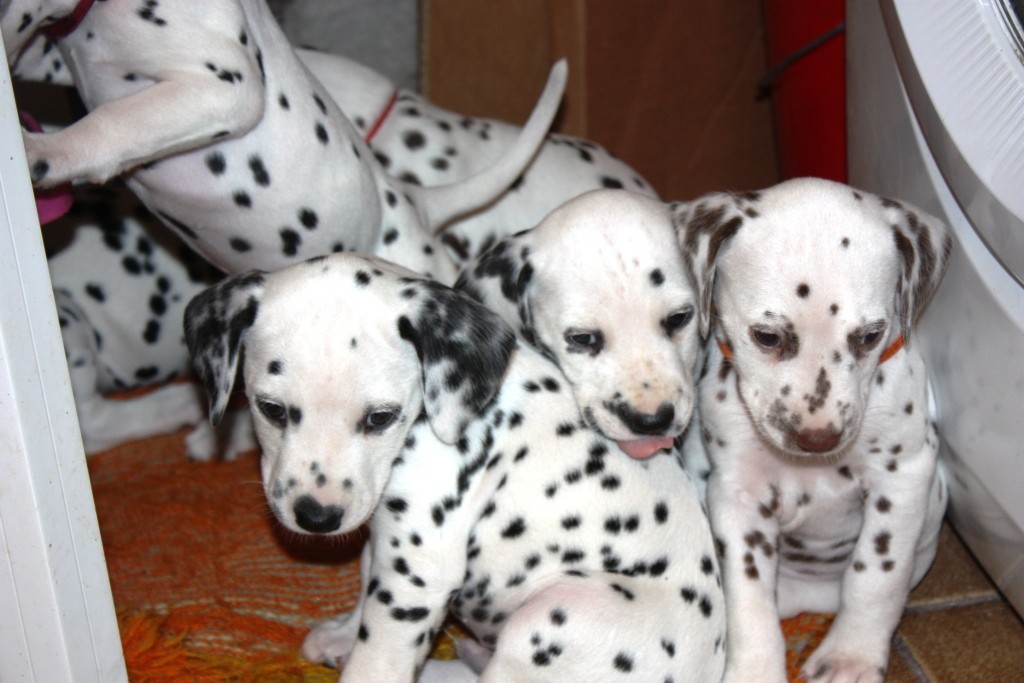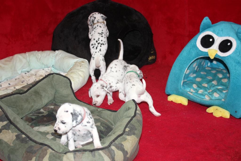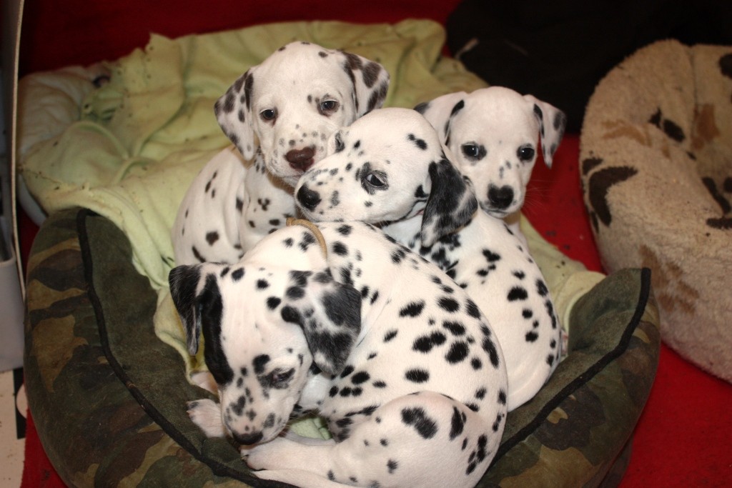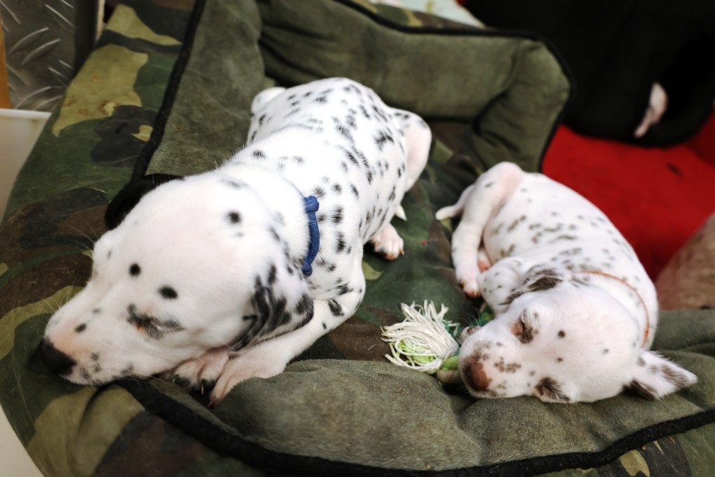 Die dritte Woche ist immer etwas anderes! Die Welpen sehen, hören und vor allen Dingen können sie laufen, spielen und schon Brei fressen. Auch die Punkte sind kräftiger geworden.